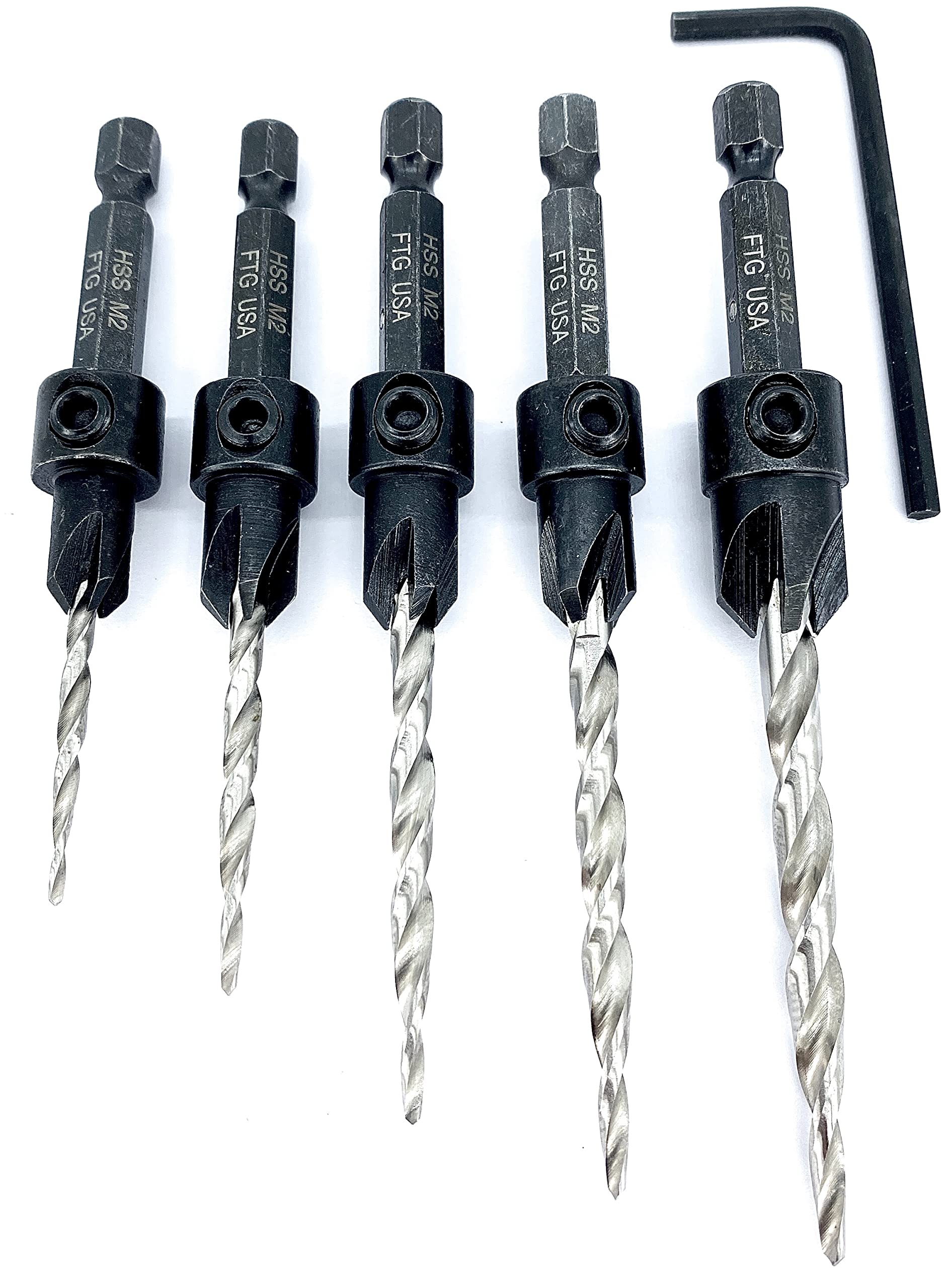 Ftg Usa Countersink Drill Bit Set 5 Pc Countersink Drill Bit 4 6 8 10 12 Tapered Drill Bits Secured With Pin To 1 4 Hex Shank 1 Allen Wrench Counter Sinker Drill Bit Set For Woodworking Amazon Com